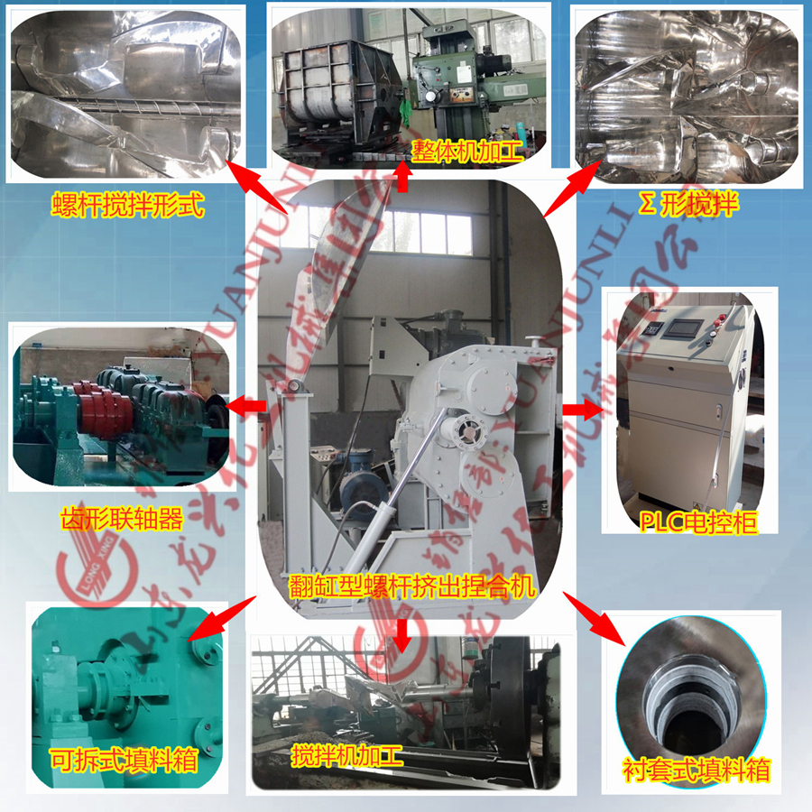 螺桿擠出型捏合機(jī)是由一對旋轉(zhuǎn)的Σ型攪拌槳葉與螺桿推送系統(tǒng)互相配合從而產(chǎn)生強(qiáng)烈剪切作用使半干狀態(tài)或橡膠狀粘稠塑料材料能使物料迅速反應(yīng)從而獲得均勻的混合攪拌。