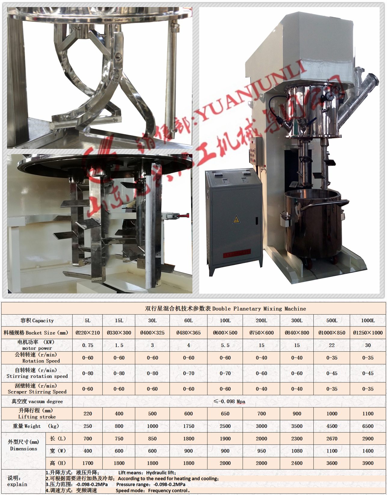 真空型雙行星混合攪拌機適用于化工、輕工、食品、電池漿料、制藥、建材、nong藥等行業所需的多組份固—固相、固—液相、液—液相物料的混合、反應、分散、溶解、調質等工藝,如硅酮密封膠、硅酮結構膠、有機硅油墨、顏料、粘膠劑、密封膠、灌裝膠軟膏、糊狀物料、潤滑脂、油漆、膏狀化妝品、膏狀食品、添加物等多種高粘稠物的制備。使用粘度范圍1-5萬厘泊左右。攪拌器的形式,根據物料要求可為多層槳葉式、框式、蝶式、渦輪式等