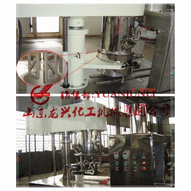 高速分散部件分單分散軸和雙分散軸兩種配置規(guī)格,高速分散部件與行星架一起公轉(zhuǎn),同時(shí)高速自轉(zhuǎn),使物料受到強(qiáng)烈的剪切與分散混合,其效果為普通混合機(jī)的幾倍。